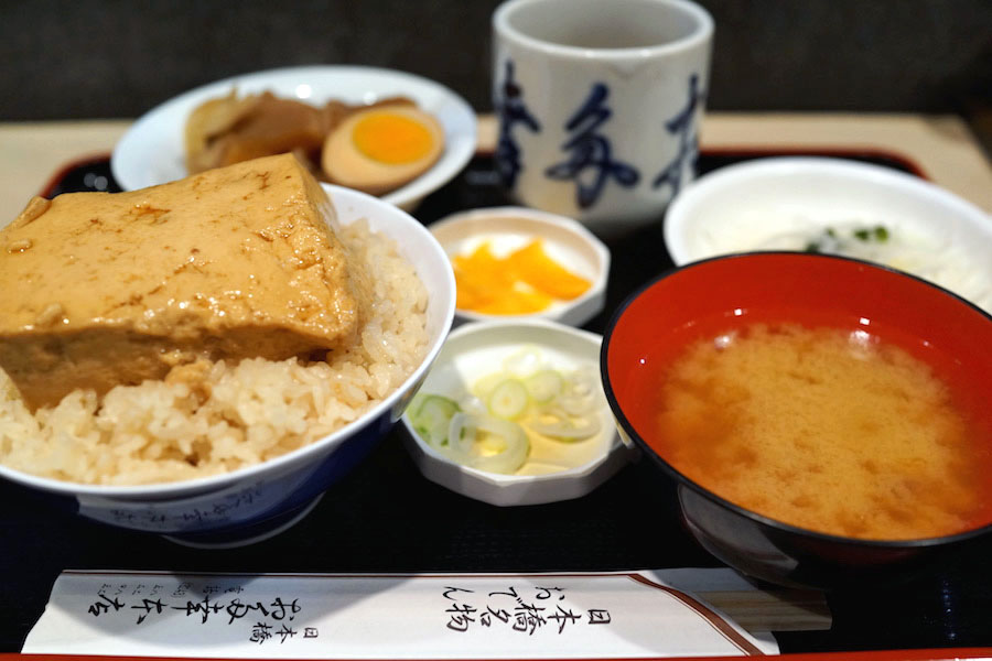おでんの出汁で炊いた茶飯の上に豆腐をドサッとのっけて、煮汁をかけてどうぞというモノ。