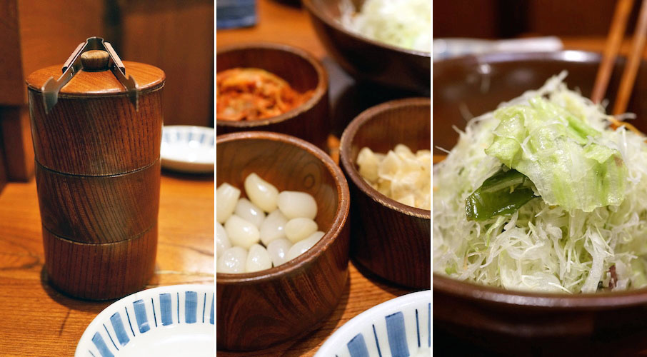 円筒形の木製の器。三段重ねの食器で、中にはキムチ、ラッキョウ、昆布漬大根が入ってて、これが自由に食べ放題。