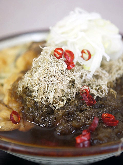 天ぷら、それからとろろ昆布を山盛りにして、丼の縁からソッと汁を注ぎ込む。