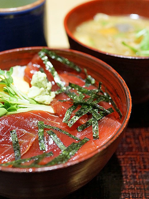 マグロの漬けダレがしみ込んで、醤油色したご飯にわさびをチョコンとのせて、パクッと食べると鼻からキーンと辛味が抜ける。