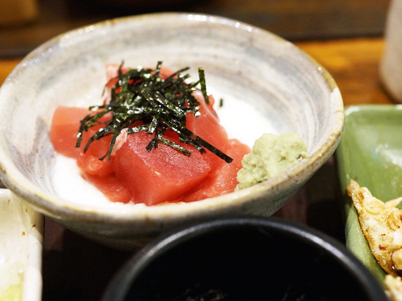 赤身のマグロのブツがどっさり入り、山芋とろろに海苔にわさびと、典型的なる酒のあて。