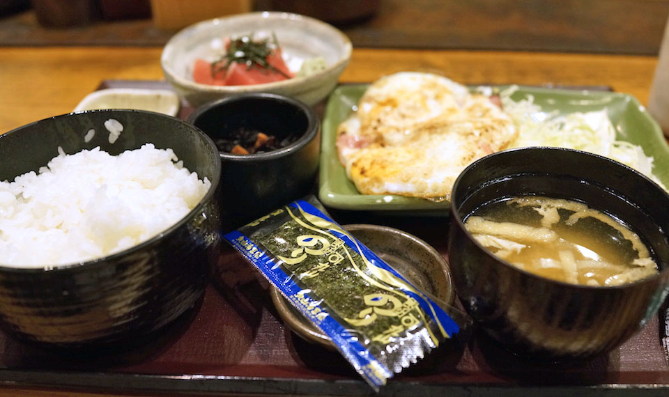 朝は朝の定食で、昼になると内容変わって昼の定食。それぞれの商品名を勢いのある筆文字で書いた半紙がペロリと垂れて、「This is Japan」っていう感じ。