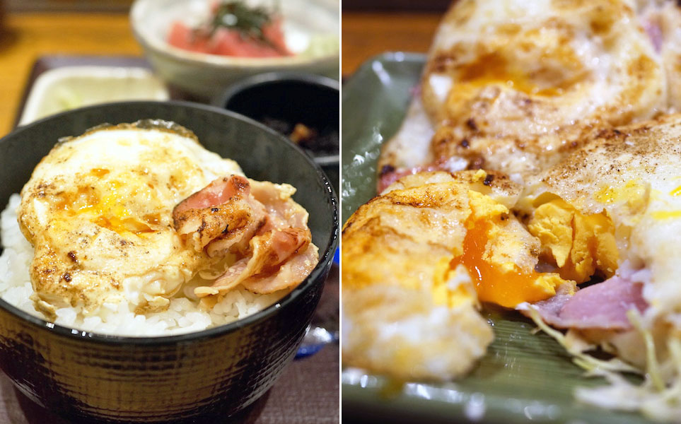 ここの目玉焼きはカリカリベーコンと一緒に焼いたベーコンエッグ。それをあえて「目玉焼き」と名乗るところが粋でいい。