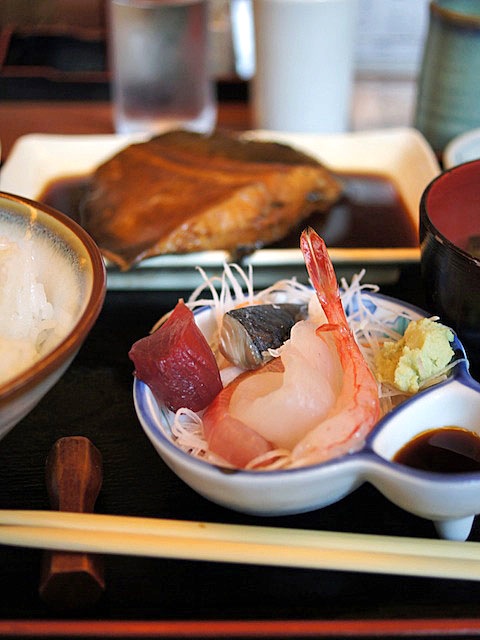 刺身定食をたのむと立派な切り身の脇に同じく、いろんな魚の切り落とし。