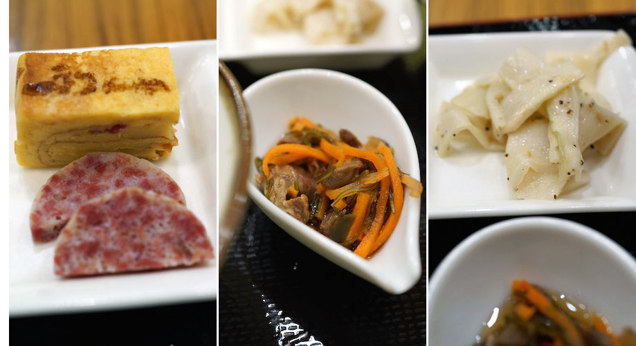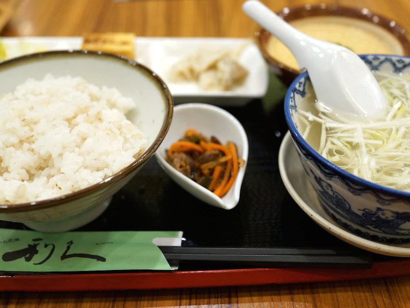 松前漬けに白菜の漬物。テールスープの旨みがたのしい厚焼き玉子にタンの端材を使ったハム。茹でたエリンギを塩ダレ和えにした一品と、どれもやさしい味わいでご飯をおいしくしてくれる。