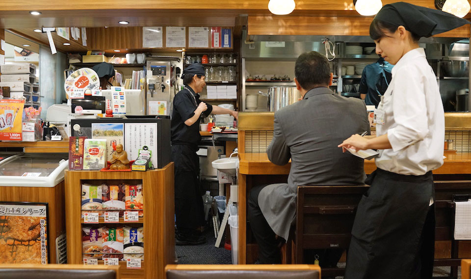 カウンターの中に厨房。その厨房の要にテールスープを炊いてる寸胴。その後ろには麦飯を入れたジャーがあり、お客様が入ってくるとそこに人がたち、すぐに商品が出せるようにと準備がはじまる。