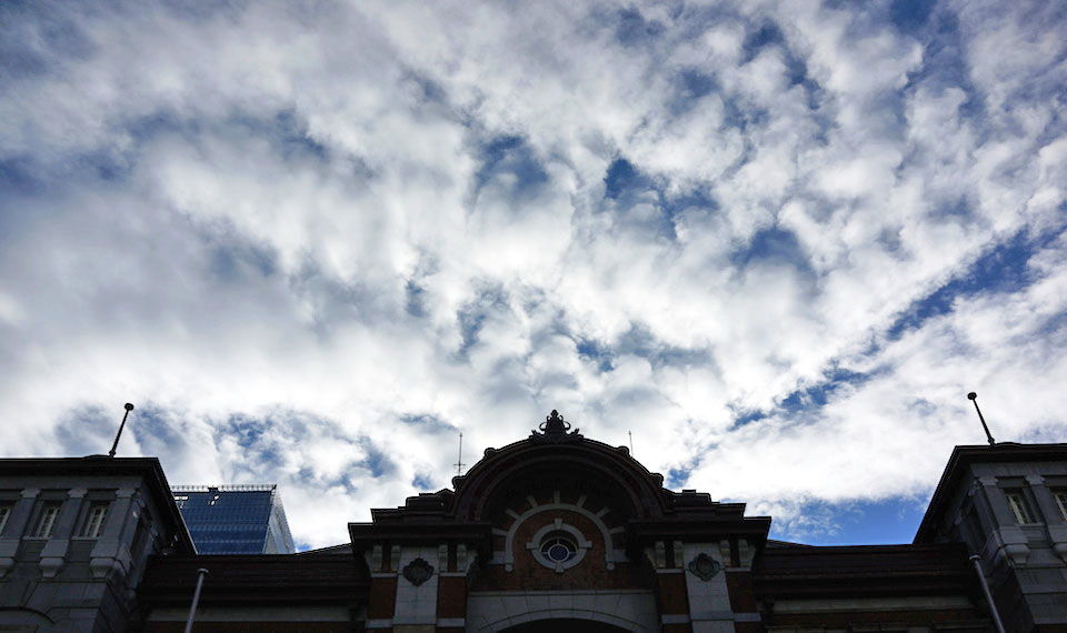 東京駅の駅舎の上に、湧き上がるような雲と向こうに青い空。みなぎる気合のような景色に、気持ちを整え、エイヤ!と思う。