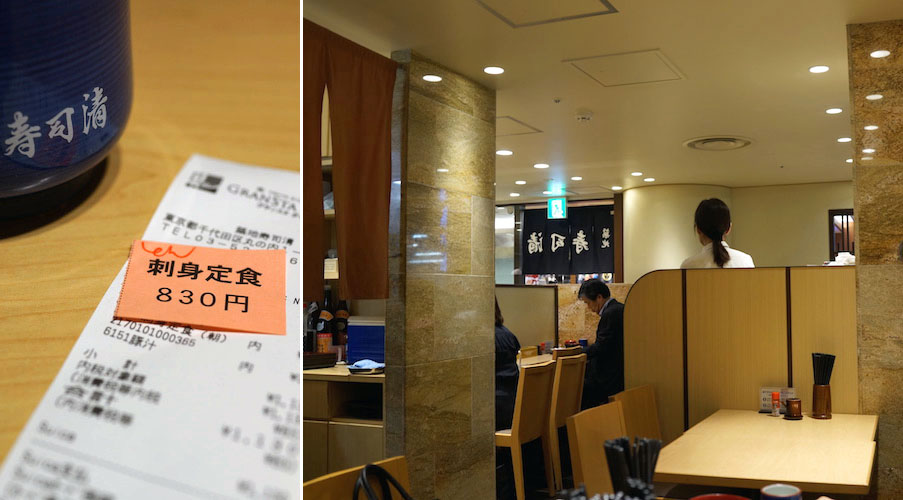 豚汁とは別についてやってくる、刺身定食用の味噌汁。かつお節の出汁がきいてる上等味で、お腹に蓋して席を立つ。