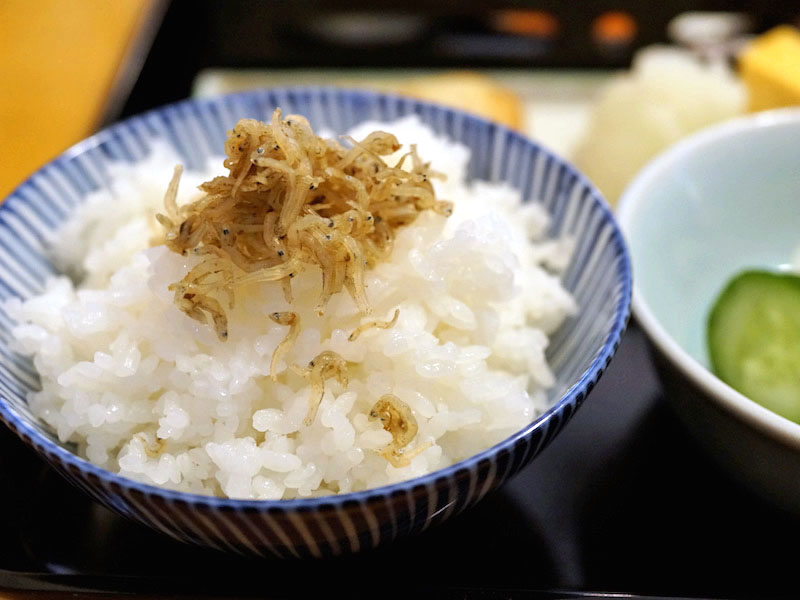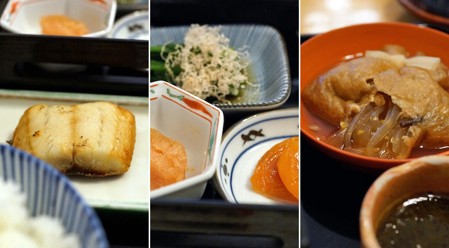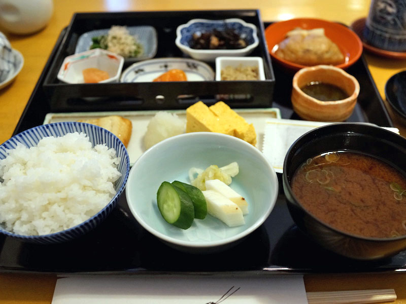 ご飯にお新香、お味噌汁。軽く使ったぬか漬けで、中でも山芋の漬物が口の中でとろけるところが味わい深い。