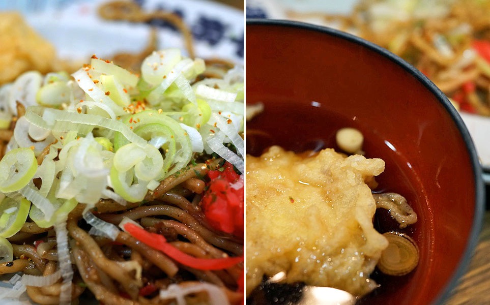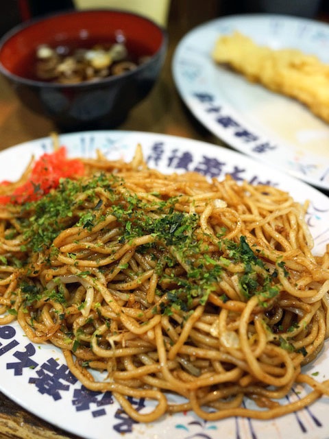 ネギをタップリ焼きそばにのせ、一味をパラリとちらしてズルリ…、お腹がたのしく満たされる。