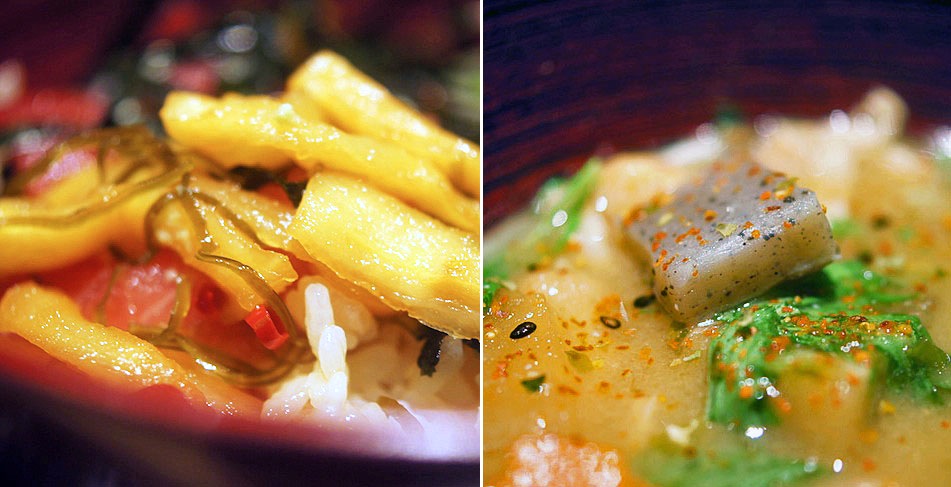 醤油のタレを吸い込んで、赤身が水分を吐き出して歯ごたえカチリとなってるところがまたおいしくて、干した大根の醤油漬けがカリコリ歯切れて、マグロの食感、ひきたてる。