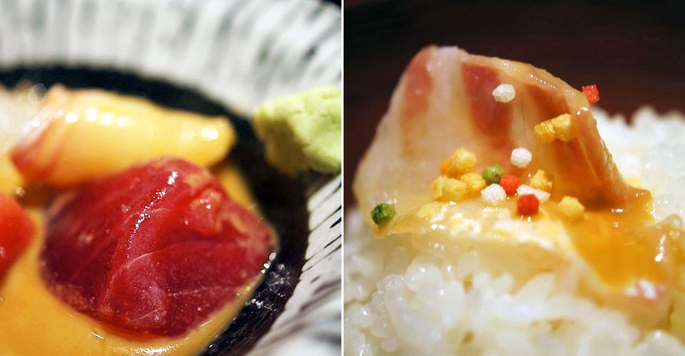 それから刺身のマグロを鯛の胡麻ダレにたっぷりつけてそして味わう。