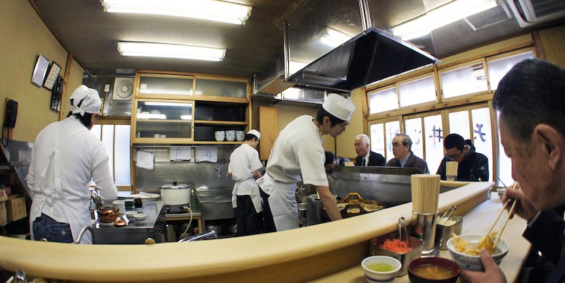 ベテランさんが後ろにたって、鍋の前で若い人が天ぷら揚げる。