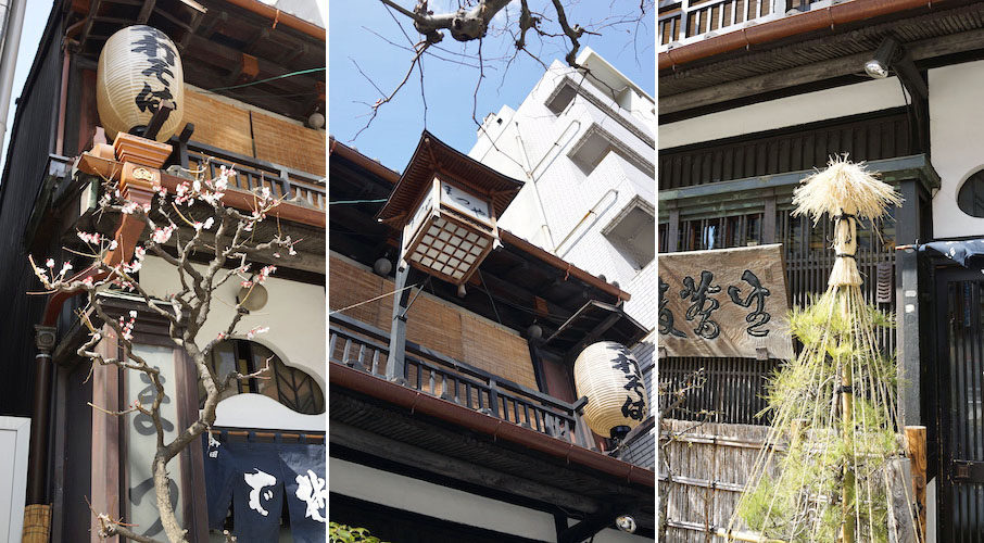 店のしつらえもさることながら、季節、季節の店先に趣向を凝らした粋な仕掛けをするのです。今の季節は緑の木立に雪よけ養生。桃の花やら梅の花やらと、冬から春に向かう景色を作ってくれる。