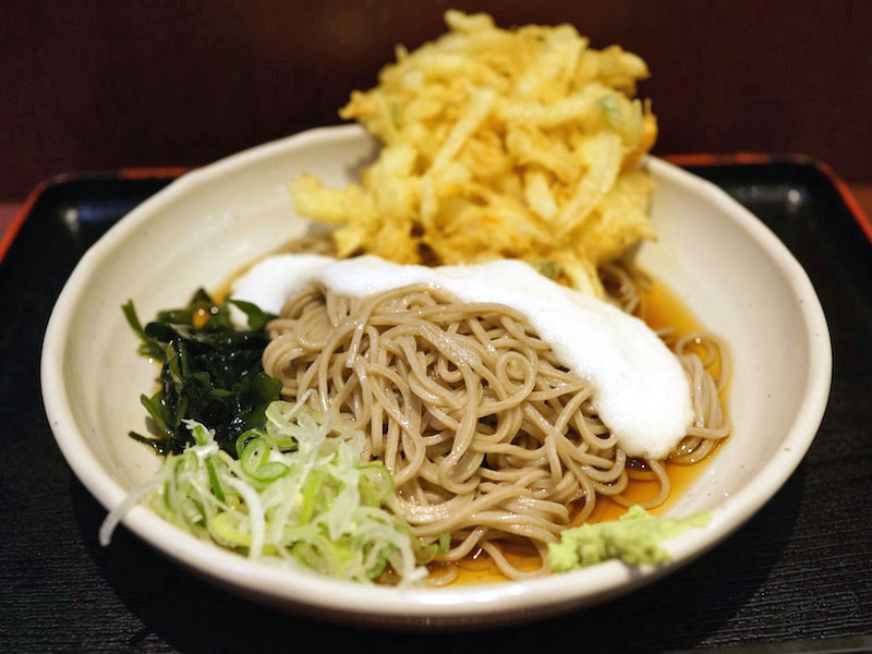 冷たいかき揚げそばに追加でとろろをのせる。