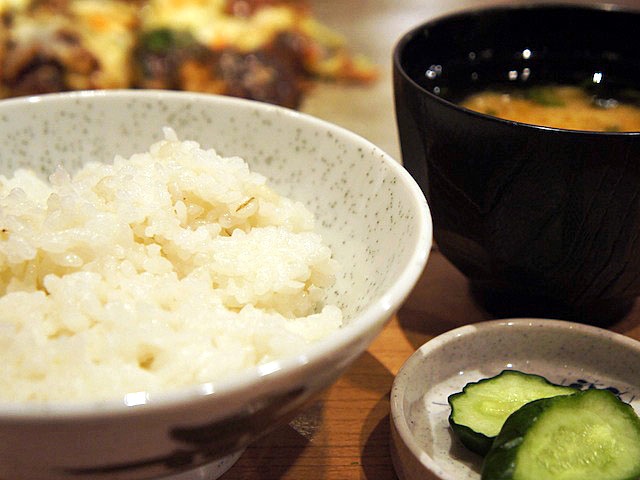 キャベツに玉ねぎ、とろろ昆布がタップリ入った味噌汁の味噌もおいしい関西風で、おなかがたのしく満たされる。