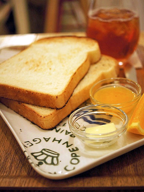 トースト二枚に、バター、それからプリザーブにオレンジがつき、飲み物一杯ついて400円。