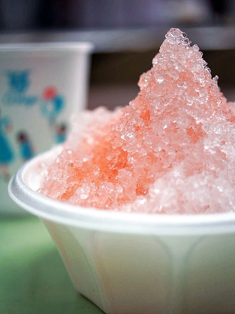 タランタランとかけまわし、透明氷を苺色にしてシャリシャリ食べる。