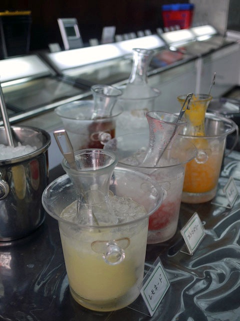 果物を搾ってそのままガラスのカラフェにタップリ入れて、氷をはったアイスバケットで冷やして並べる。