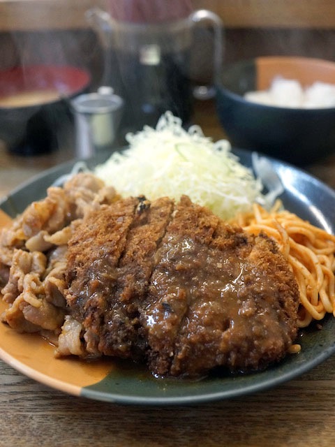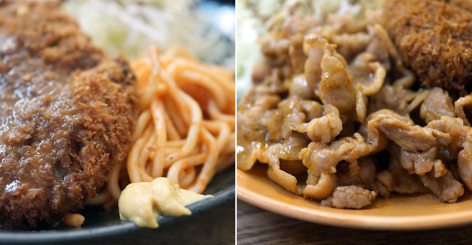 メンチカツと生姜焼き、千切りキャベツとナポリタンがひとつお皿に幸せそうに身を寄せ合って盛られてる、これにご飯と味噌汁がついて一揃え。