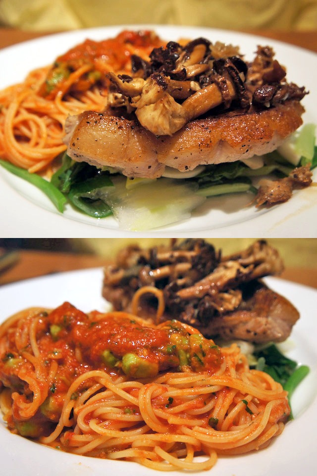 豚肉側から画像をとるとパスタが付け合せのようになり、逆に撮るとパスタの料理のように映るという不思議。