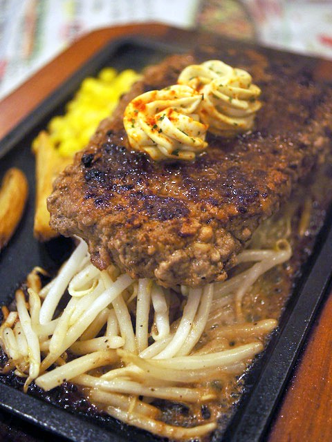 鉄板の上にモヤシをのっけて、焦げ付かないようした上にのっかる肉の塊は、まさにステーキ。
