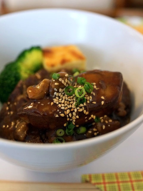サイドに茹でたブロッコリと、マッシュポテトのグラタンをおき、これがご飯の上でなければ「ステーキ・ア・ラ・ロッシーニ」でございます。