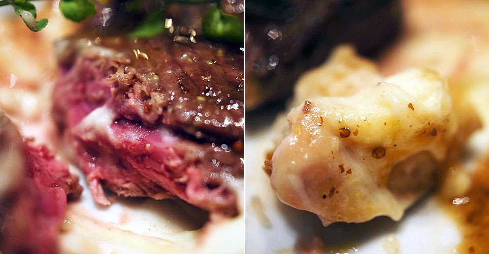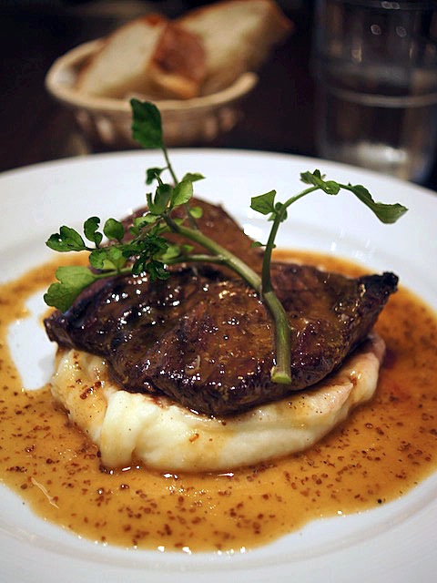 マッシュポテトの上にツヤツヤ、脂でかがやくハラミのステーキ。