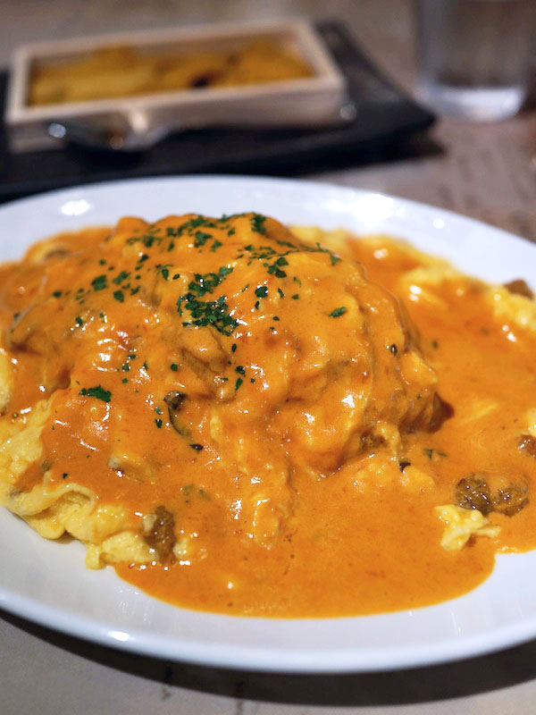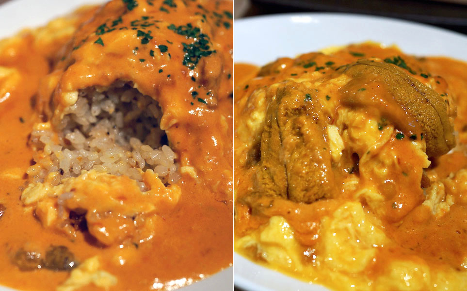 小さめのお皿に控え目量のトロトロ系のオムライス。ウニ色をしたソースがたっぷりかかってて、ウニの香りがかなり濃厚。