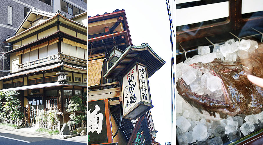 炭の強火でグラグラ煮立てて味わう、昔ながらの鶏鍋ふるまう「ぼたん」や、日本庭園をもった見事な藪そばの民家造りの店をブラブラ歩いてみながら、ビックリしたのがあんこう鍋の「いせ源」ていう店の店頭に、あんこうげ一尾、氷を口に一杯つめ込まれ恨めしそうに空を見ていた。