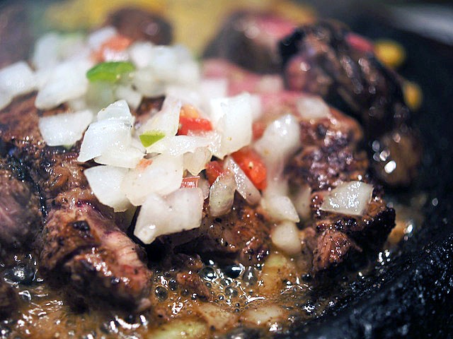 肉にのせるとライムジュースが下にたれ、焼けた鉄板とキスしてジュワッ。