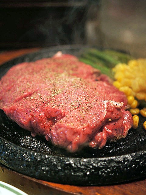 しかも筋をキレイに切り取って、おいしいとこだけ正味300gが鉄板の上でジュウジュウしてる。