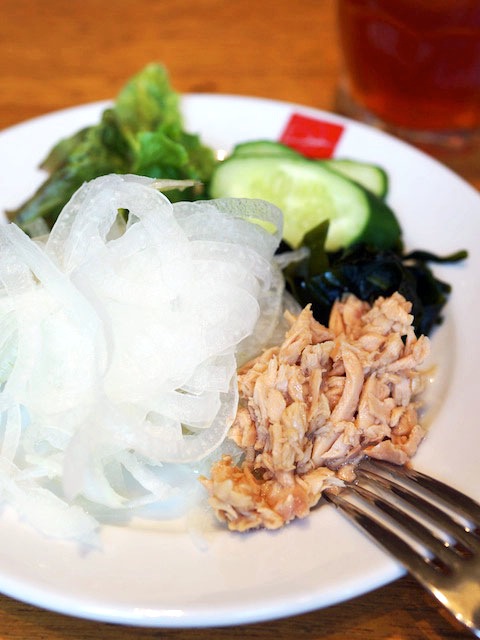 ツナのうま味に脂の風味、青い香りのキュウリにワカメをクニュっと食べて、朝のお腹を整える。