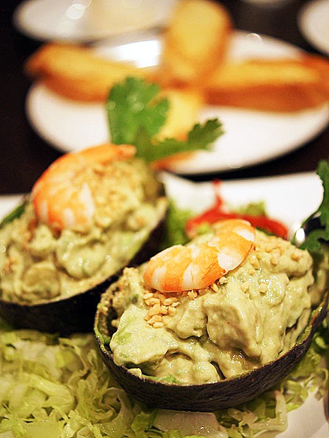 よく熟したのを崩してペイスト状にして、上にゆで海老。