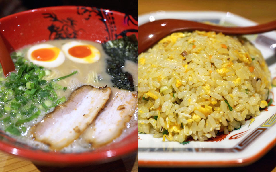 チャーハンたのんでみればこれもパラパラおいしく、しかも中に魚粉をまぜて煽ってる。これまたとんこつラーメンと一緒に食べると、互いの味を引き立ててどちらもおいしくなっていく。