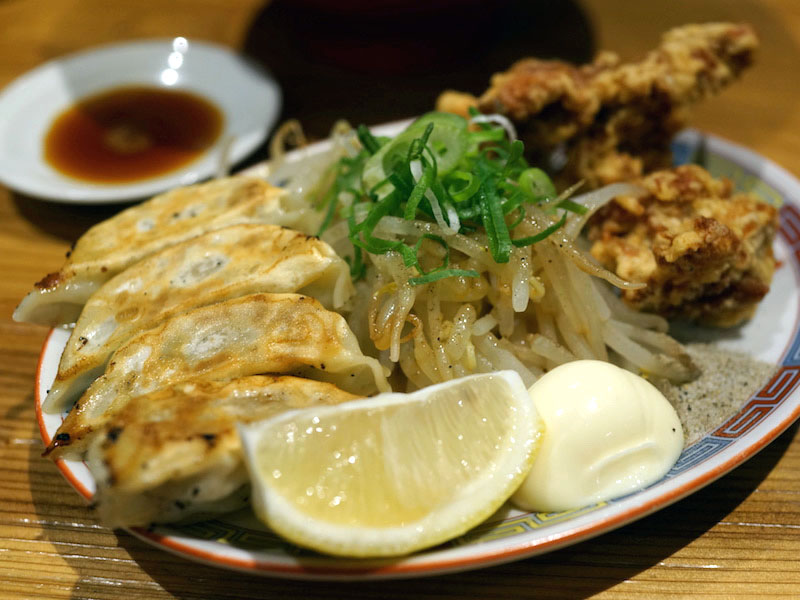 「歌舞伎町盛り」っていうラーメン屋的サイド料理の盛り合わせ。餃子に唐揚げ、茹でたもやしのタレがけが小さなお皿にひしめき合ってやってくる。