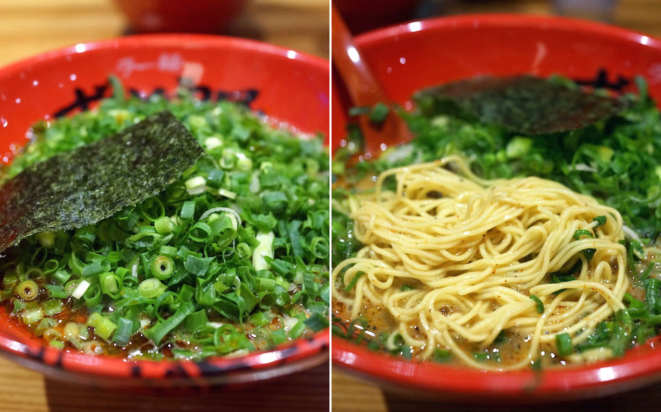 とんこつスープに辛味を足したホットスープ。麺は細いストレート麺を選んで上にネギをタップリ。スープは背脂控えめのあっさり味で作ってもらう。