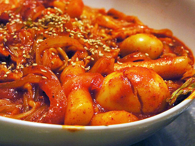 甘辛ソースで韓国の餅を煮こんでそこに、韓国おでんをくわえたモノ。