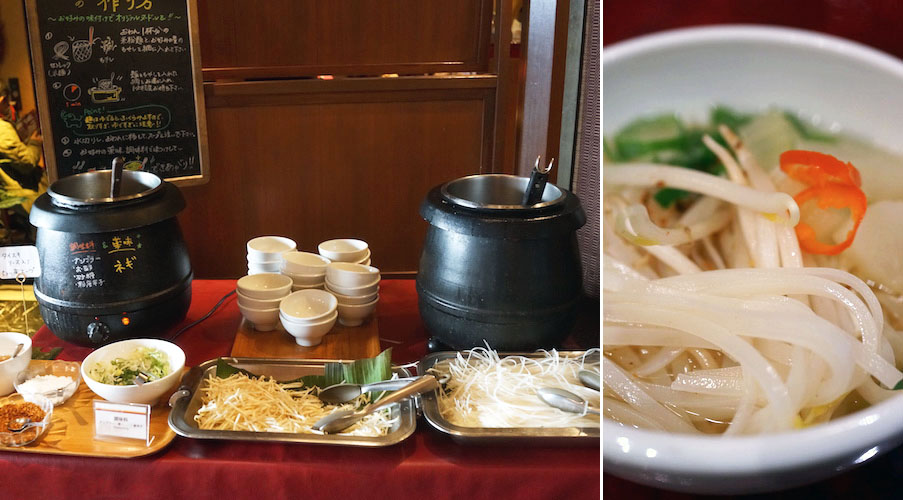 茹でたらそれをボウルに入れて、もうひとつのポットに入ったスープにかけ回す。スープの中にはセロリと大根。ネギやヌクマム、赤唐辛子の酢漬けが薬味で用意されてて、生のもやしものっけてズルリ。こういう自分で作れる料理があるとなんだか調理参加をしているみたいでオモシロイ。