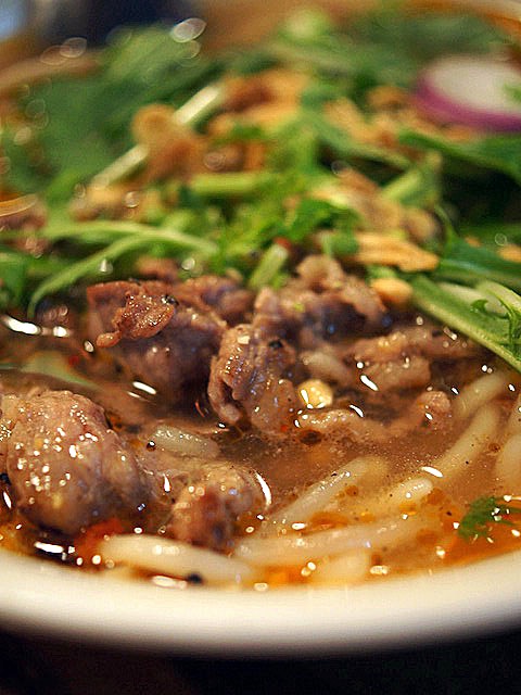 生のモヤシや刻んだネギ、揚げたニンニク、玉ねぎをタップリいれて茹でたばかりの熱々のフォーをひたしてズルンと食べる。