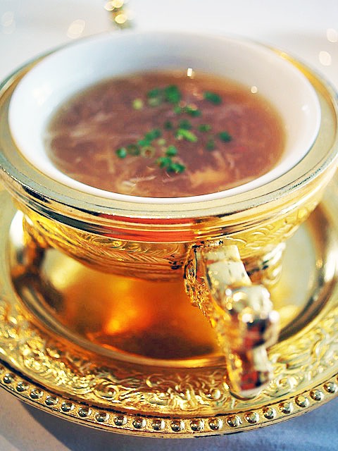 入ってやってきた器がゴージャス…、黄金の龍のレリーフが入った黄金色のボウルで実は龍がうずくまった形の蓋がついていた。