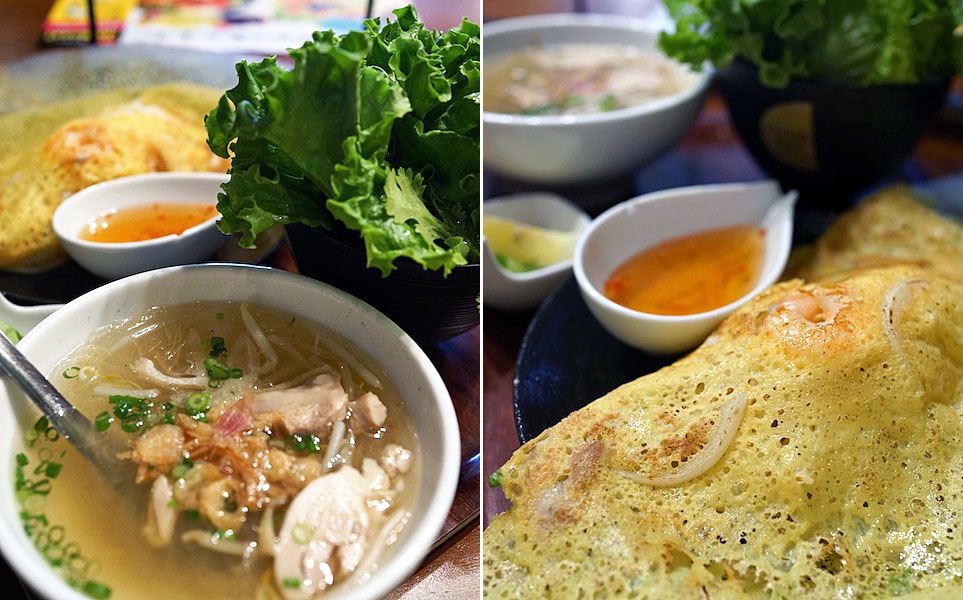 1000円という値段が手頃で、バインセオと鶏のフォーがセットになってる。