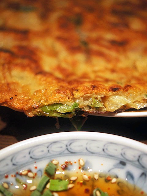 薄く四角く焼きあがる、チヂミの生地の中から青い野菜が見える。