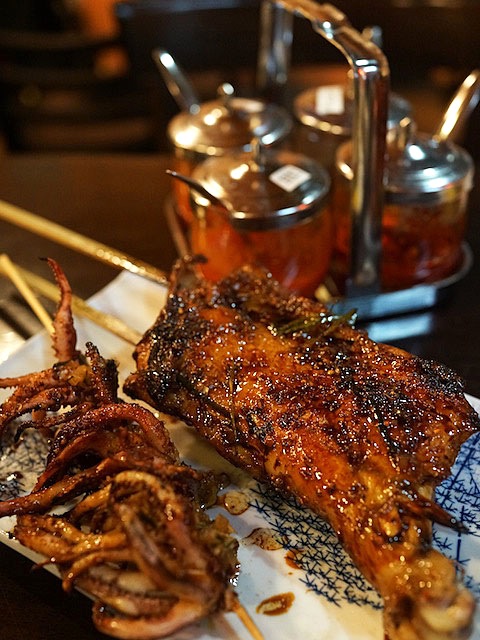 鶏もも肉の焼き物にイカの串焼き。