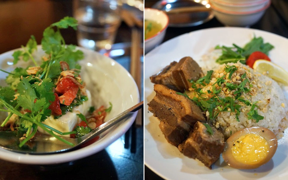 まずはパクチー豆腐という、オキニイリの前菜をとる…、豆腐にヌクマム、米酢をくわえパクチーたっぷり、トマトにフライドオニオンを薬味に食べる、食欲そそる涼しい一品。