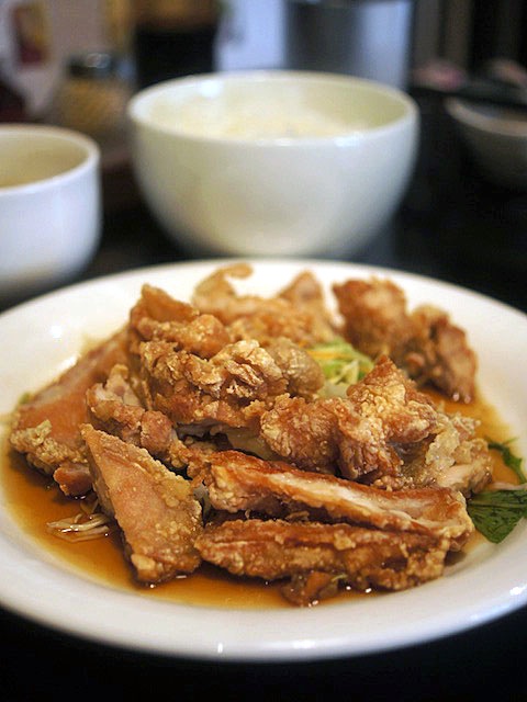 油で揚げた鶏肉に、酸味のきいたタレをかけて食べる普通は前菜的に食べるモノ。