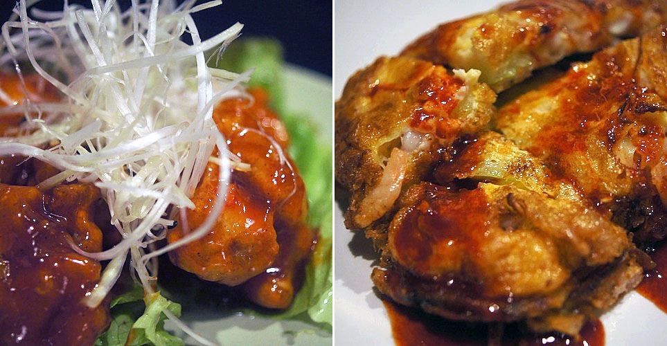 ヤンニョムチキンっていう、甘辛ダレで和えたフライドチキンであったり、海鮮チヂミにスキッと辛くて若干酸っぱい、韓国の刺身料理のお店で刺身と一緒に食べるソースをかけて味わったりと、ちょっとひねった料理がたくさん。
