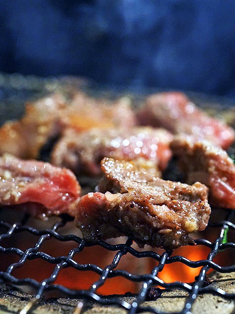 滲んで落ちた脂が炭でジュワッと焦げて蒸発し、おいしい香りが混じった煙でいぶされていく。