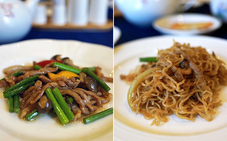 一品料理は3種類、麺が全部で7つとたのしく迷える程度のバリエーション…、それで豚肉とにんにくの茎の炒め物。