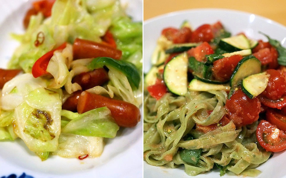 最後にピーマンを入れて炒めて、まるで焼きそばの「抜き」のような料理に仕上げる…、シャキシャキ、クニュリとキャベツ独特の食感たのしく、お腹潤う。